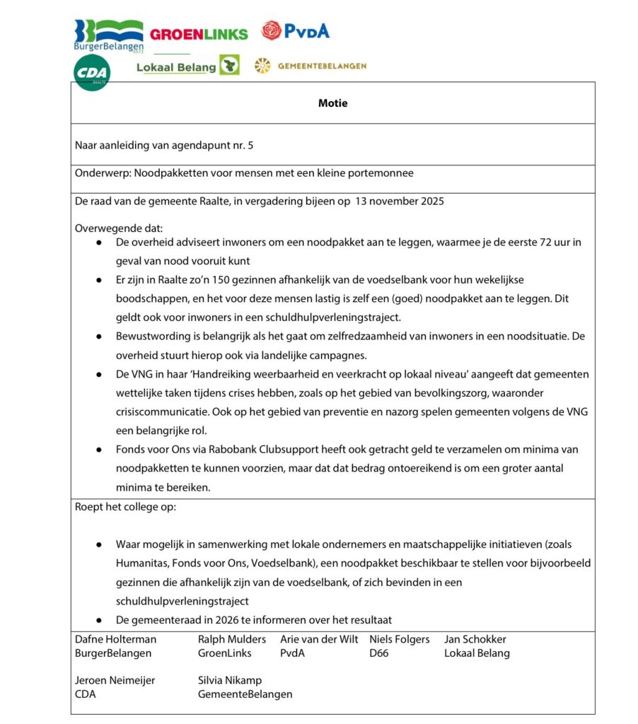 Door onze motie wordt “waar mogelijk in samenwerking met lokale ondernemers en maatschappelijke initiatieven een noodpakket beschikbaar gesteld voor inwoners van de Gemeente Raalte die bijvoorbeeld afhankelijk zijn van de Voedselbank Raalte of in een schuldhulpverleningstraject zitten”.